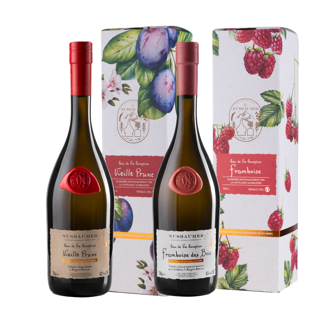 La gamme des « Eaux-de-vie d'Exception » représentent le meilleur du savoir-faire de la distillerie Nusbaumer. Celles-ci sont présentées dans une bouteille de teinte ambrée qui les protège de la lumière. La cire apposée, en médaillon, d'une belle couleur intense, est réalisée à la main dans leurs ateliers. Cette eau-de-vie d'exception de Mirabelle est puissante et ronde de par sa fabrication atypique : la double distillation.