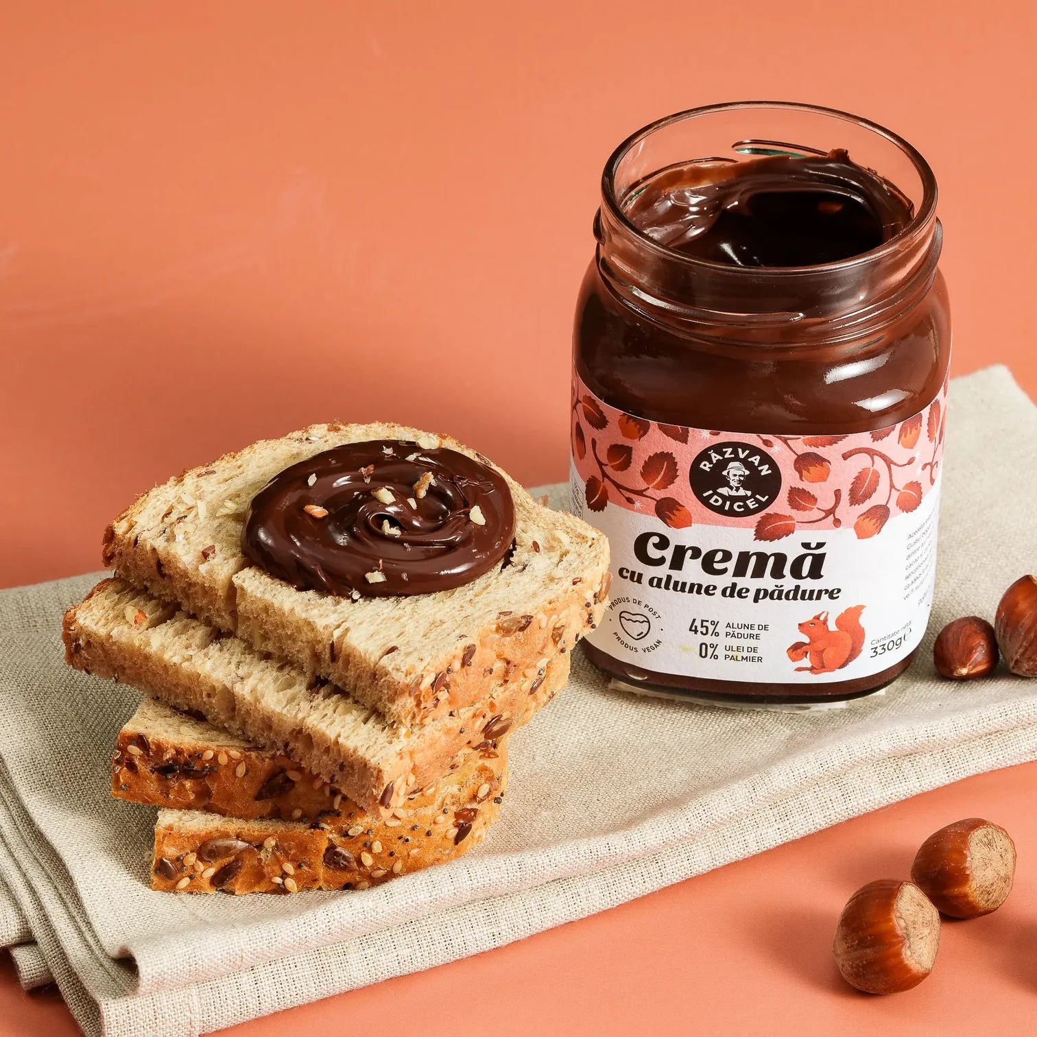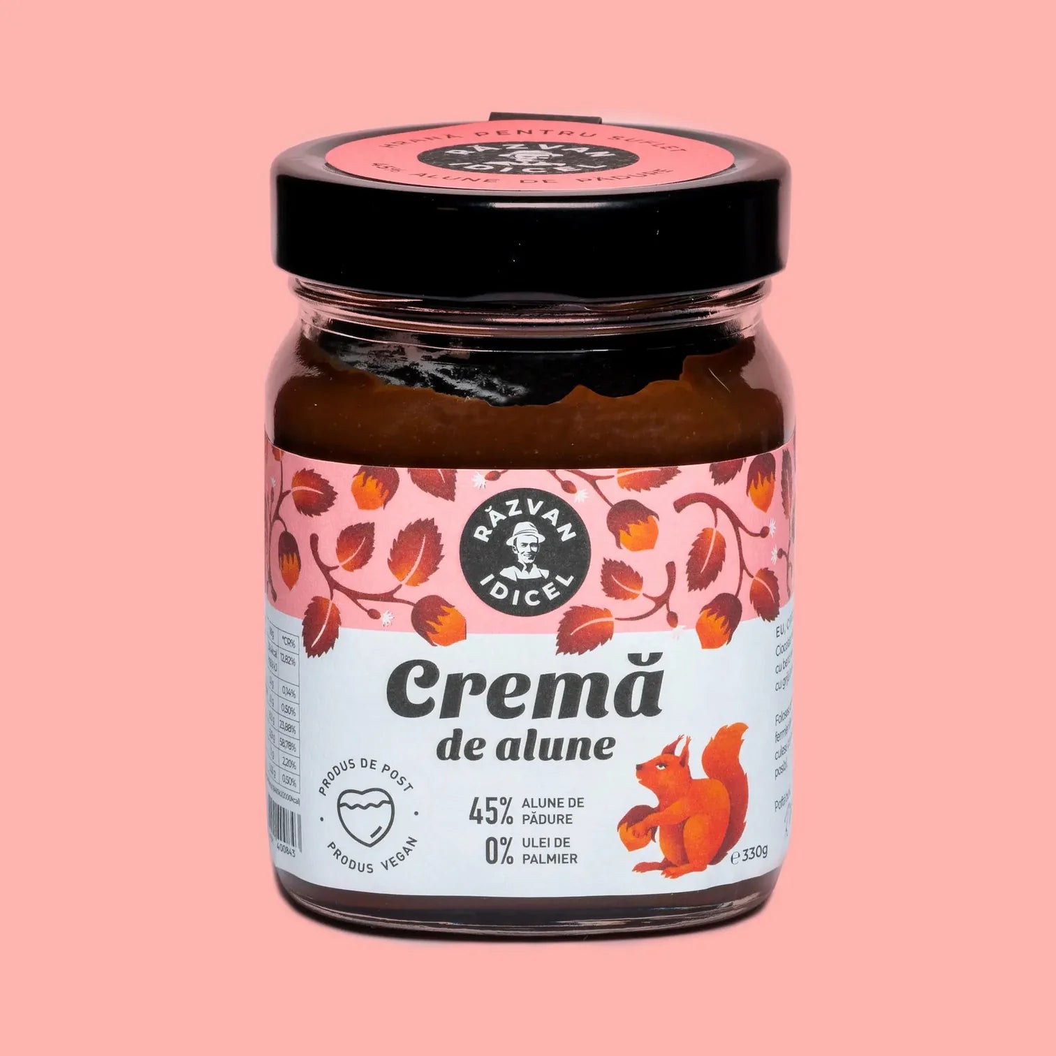 La Crème de Noisettes au Cacao Răzvan Idicel associe 45 % de noisettes légèrement grillées à un cacao de la plus haute qualité, offrant une saveur intense et une énergie 100 % naturelle.