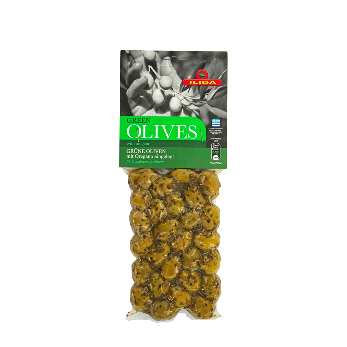 Olives vertes 95%, huile dʼolive, origan0,8%, acide citrique, acide lactique, sel. Conditions particulières de conservation: Produit sous vide, à conserver au frais après ouverture & consommer sous 5 jours